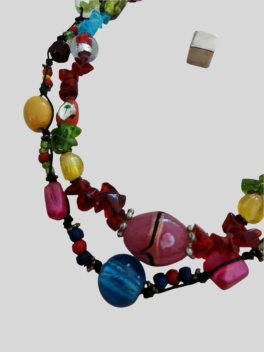 Farverig halskæde med plastikkugler og karabinhagelukning.