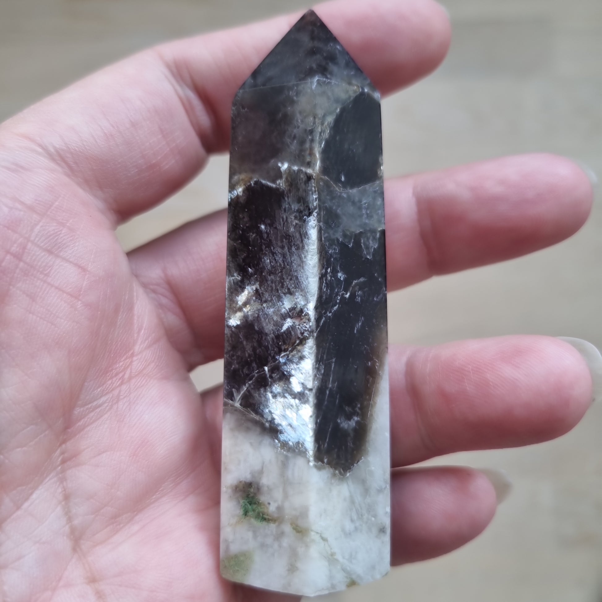 Røgkvarts med mica kombinerer røgkvartsens groundende og beskyttende energi med micaens reflektive klarhed, hvilket skaber balance og stabilt energiflow.