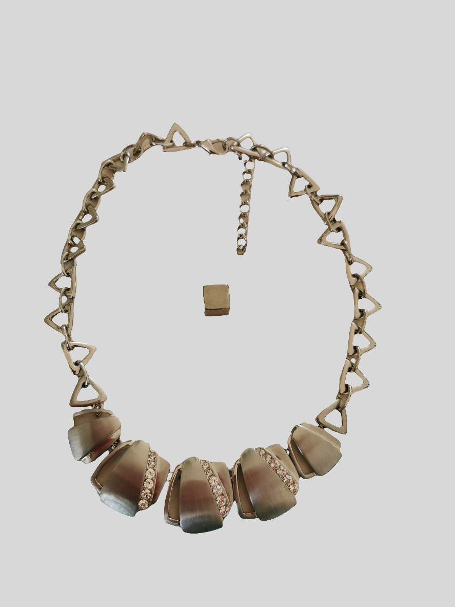 Halskæde i "sølv" med vedhæng, og vedhænget måler ca 2,5 cm.